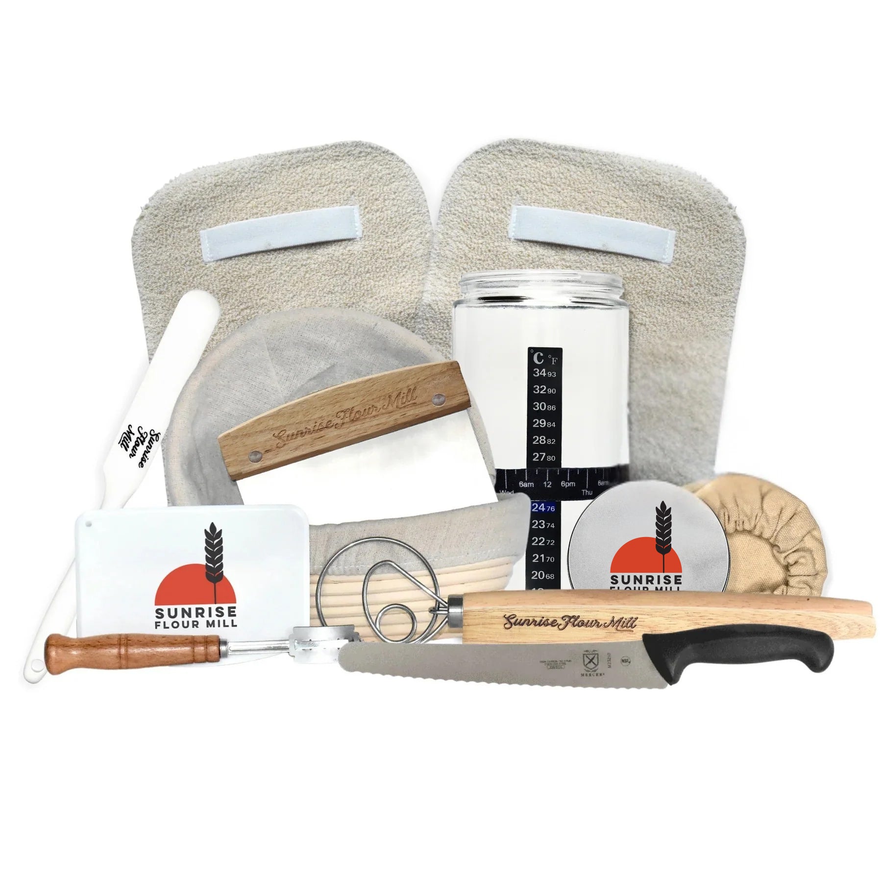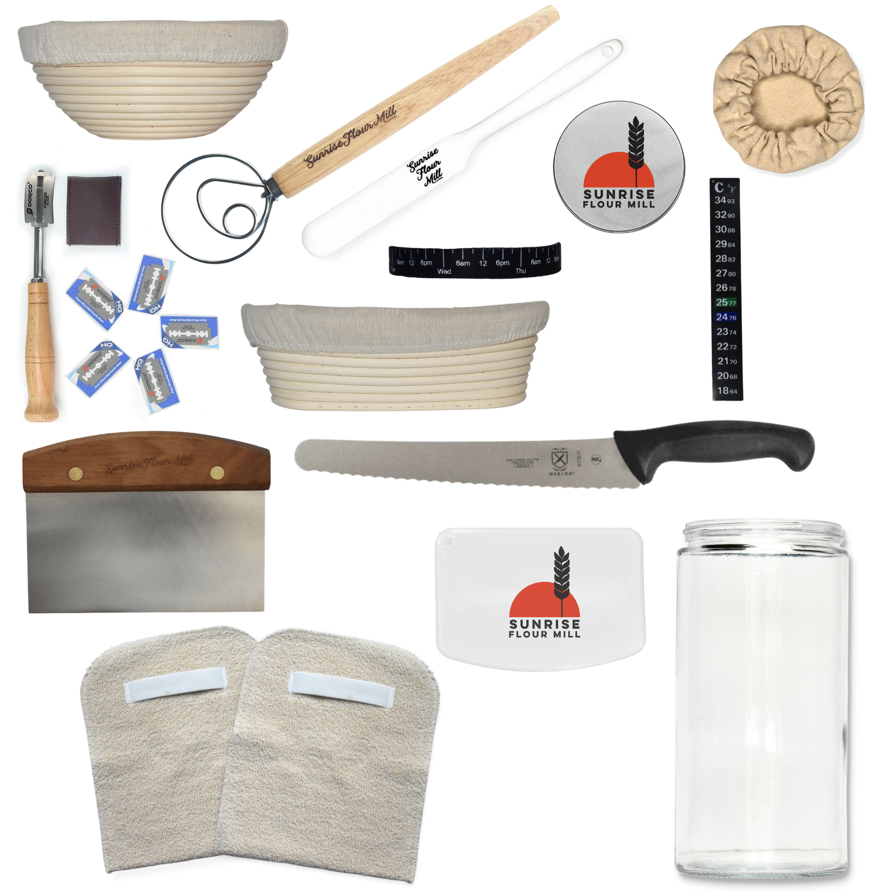 All the tools you need, all in one spot. Our new tool kits feature every tool we offer, including 2 Banneton Bread Proofing Baskets with linen liners, a Danish Dough Whisk, Lame Scoring Tool, Bread Knife, Plastic Dough Scraper, 900ml Glass Sourdough Starter Jar, Date Marked Feeding Band, Thermometer, Sourdough Fermentation Jar Scraper, Sewn Cloth Cover, Metal Lid, Bakers Pads (Two Pack), Turner, and a Pizza Cutting Tool.